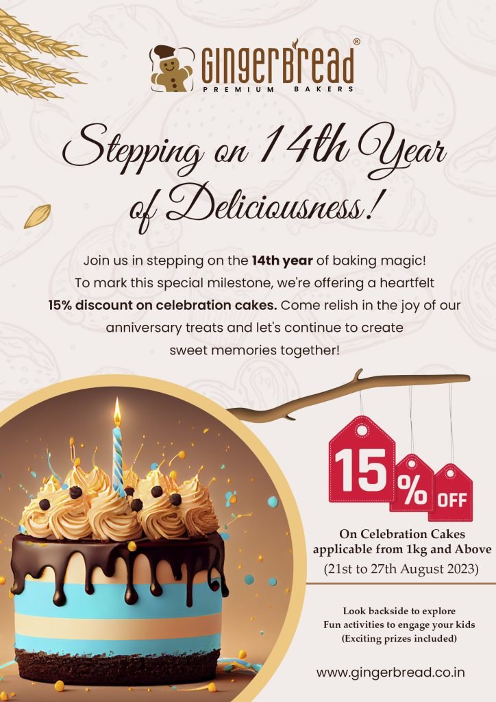 Celebrate with us as we embark on the 14th year of creating enchanting baking wonders on 22nd August! To mark this momentous occasion, we’re excited to offer a heartfelt 15% discount on Celebration Cakes for 1 kg and above orders!. While your children indulge in fun-filled activities and have the chance to win exciting cash voucher prizes, let’s come together to craft unforgettable memories.